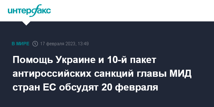 Помощь Украине и 10-й пакет антироссийских санкций главы МИД стран ЕС обсудят 20 февраля