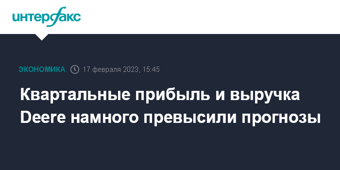Москва. 17 февраля. INTERFAX.RU - Крупнейший в мире производитель сельхозтехники Deere & Co. в первом квартале 2023 финансового года (завершился 30 января) увеличила чистую прибыль более чем в два раза и нарастила выручку на треть, причем оба показателя оказались значительно лучше ожиданий рынка.
