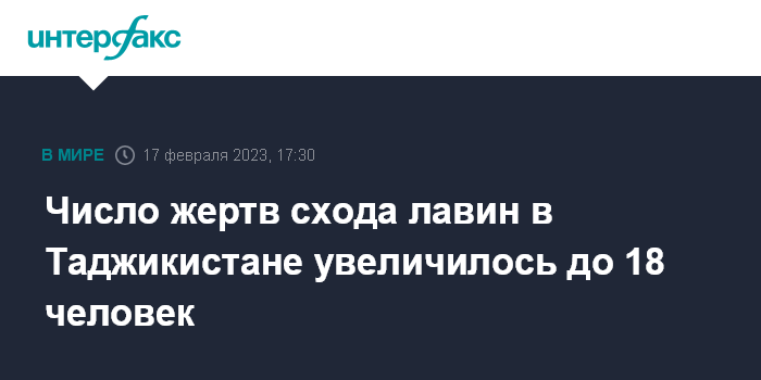 Москва. 17 февраля. INTERFAX.RU - В результате схода лавин на территории Таджикистана по состоянию на вечер 17 февраля погибли 18 человек, сообщила начальник пресс-центра Комитета по чрезвычайным ситуациям (КЧС) республики Умеда Юсуфи.