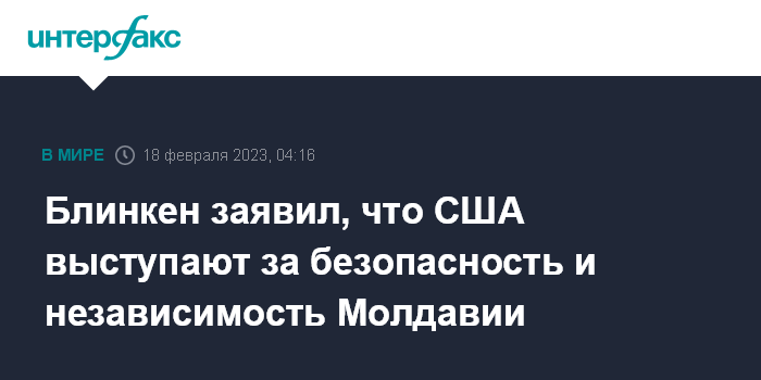 Москва. 18 февраля. INTERFAX.RU - Соединенные Штаты поддерживают усилия для обеспечения "безопасности, независимости и территориальной целостности" Молдавии, заявил госсекретарь США Энтони Блинкен.