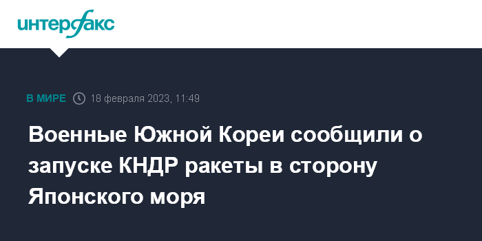 Москва. 18 февраля. INTERFAX.RU - КНДР в субботу осуществила пуск баллистической ракеты в сторону Японского моря, сообщают южнокорейские СМИ со ссылкой на заявление военных.