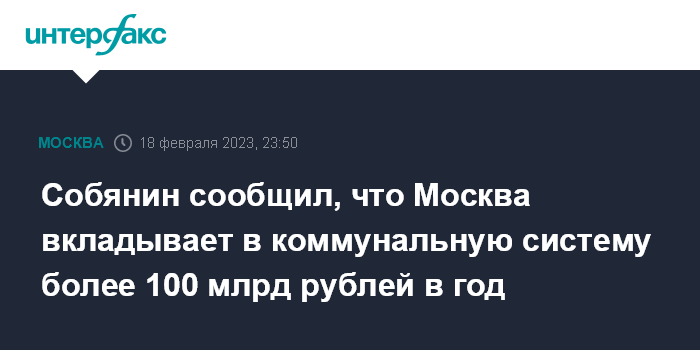 Москва. 18 февраля. INTERFAX.RU - Ежегодно в работу коммунальной системы столицы вкладывается 100 млрд рублей, сообщил мэр Москвы Сергей Собянин.