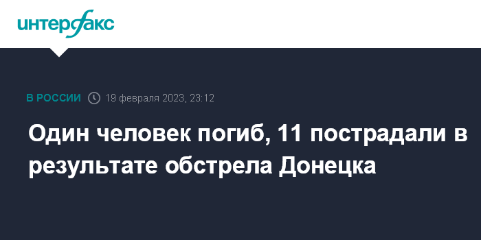 Москва. 19 февраля. INTERFAX.RU - Обстрел центра Донецка привел к гибели одного человека, 11 получили ранения, сообщили в воскресенье в штабе территориальной обороны Донецкой народной республики.
