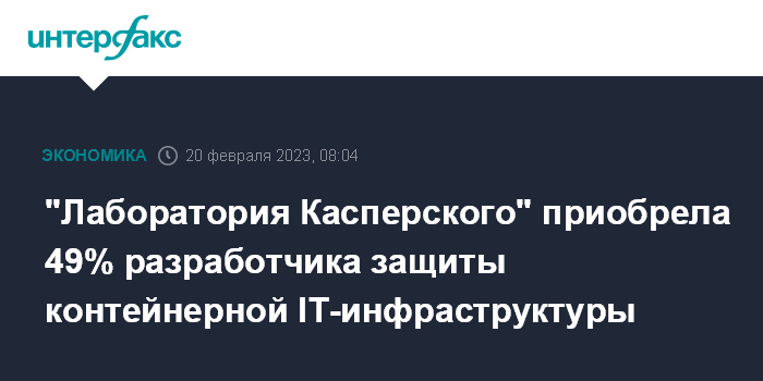 Москва. 20 февраля. INTERFAX.RU - "Лаборатория Касперского" сообщила, что приобрела 49% в компании Ximi Pro, которая работает в сфере обеспечения безопасности контейнерной IT-инфраструктуры (контейнеризация, один из видов виртуализации, позволяющих запускать сторонние приложения в изоляции от операционной системы).