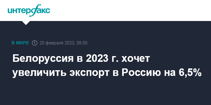 Москва. 20 февраля. INTERFAX.RU - Белоруссия в 2023 году рассчитывает нарастить свой экспорт в Россию на 6,5%, сообщил заместитель министра экономики республики Дмитрий Ярошевич.