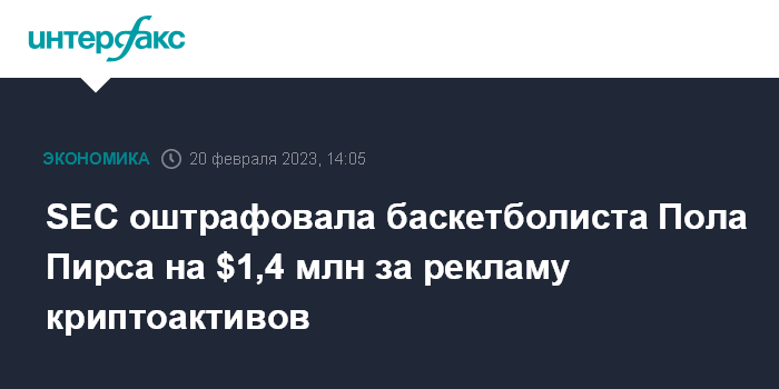 Москва. 20 февраля. INTERFAX.RU - Комиссия по ценным бумагам и биржам США (SEC) наложила штраф в размере $1,4 млн на бывшего баскетболиста Пола Пирса за незаконную рекламу криптовалюты.