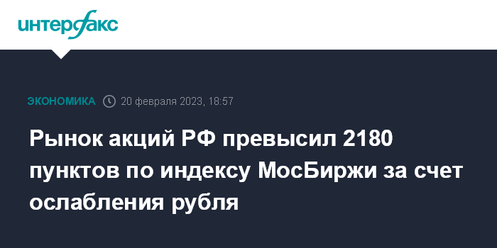 Москва. 20 февраля. INTERFAX.RU - Рынок акций РФ к закрытию основных торгов в понедельник превысил 2180 пунктов по индексу МосБиржи за счет ослабления рубля и внутренних макроэкономических новостей, хотя в первой половине дня на рынке преобладали продажи в условиях геополитической напряженности в преддверии важных событий недели (послания президента РФ Владимира Путина Федеральному собранию 21 февраля и введения антироссийских санкций США, ЕС и G7 в годовщину начала специальной военной операции, 24 февраля).