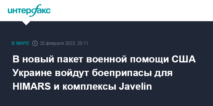 Москва. 20 февраля. INTERFAX.RU - Очередной пакет военной помощи США Украине на сумму в $460 млн включает в себя, в частности, боеприпасы для реактивных систем залпового огня (РСЗО) HIMARS и 155-миллметровые артиллерийские снаряды, сообщает The Washington Post со ссылкой на заявление Пентагона.
