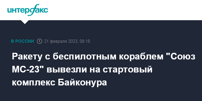 Москва. 21 февраля. INTERFAX.RU - Ракета-носитель "Союз-2.1а", которая 24 февраля отправит к Международной космической станции (МКС) беспилотный корабль "Союз МС-23", установлена на стартовом комплексе космодрома Байконур, сообщили в "Роскосмосе".