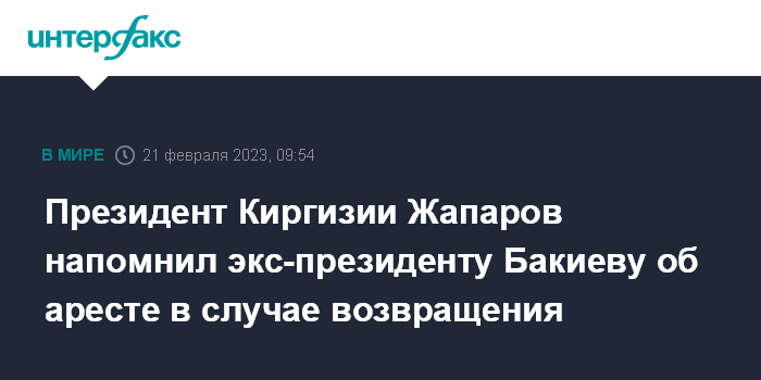 Москва. 21 февраля. INTERFAX.RU - Бывший президент Киргизии Курманбек Бакиев, в случае своего возвращения на родину, будет взят под стражу, сообщил во вторник нынешний президент Киргизии Садыр Жапаров.