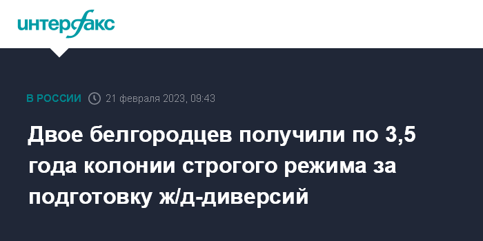 Москва. 21 февраля. INTERFAX.RU - Белгородский областной суд признал виновными в подготовке к диверсии двух жителей Белгорода, собиравшихся повредить железнодорожные пути, сообщила пресс-служба УФСБ по Белгородской области.