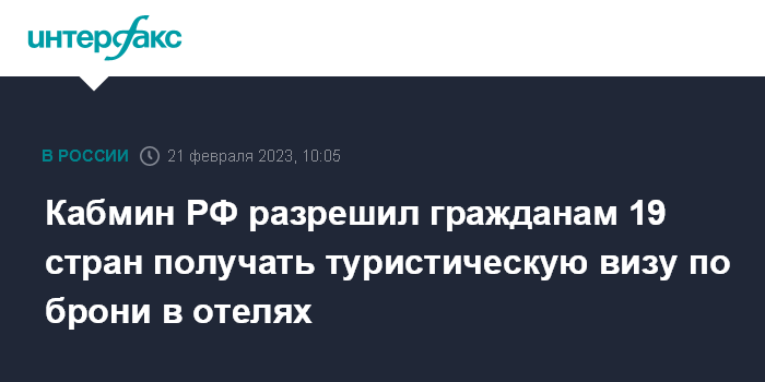 Москва. 21 февраля. INTERFAX.RU - Правительство разрешило гражданам 19 стран получать въездные визы в Россию на срок до шести месяцев на основе бронирования места в отеле.