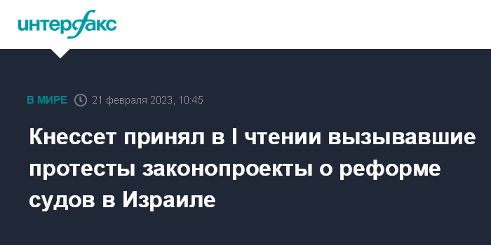 Москва. 21 февраля. INTERFAX.RU - Депутаты Кнессета после многочасовых дебатов и на фоне масштабных акций протеста в ночь на вторник одобрили в I чтении законопроект о порядке назначения судей и законопроект, препятствующий отмене основных законов БАГАЦем (Верховным судом) в рамках юридической реформы, сообщает во вторник Times of Israel.