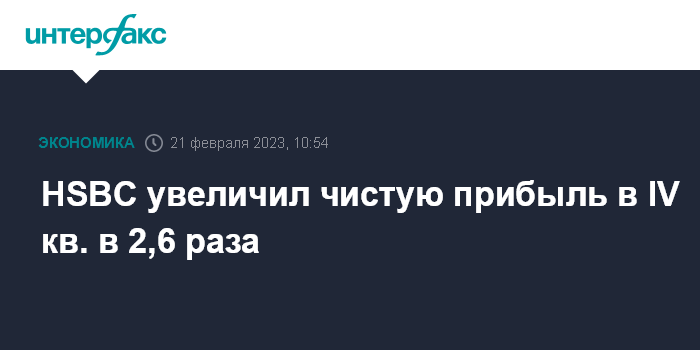Москва. 21 февраля. INTERFAX.RU - Британский банк HSBC Holdings Plc увеличил чистую прибыль в четвертом квартале 2022 года в 2,6 раза благодаря подъему процентных ставок.
