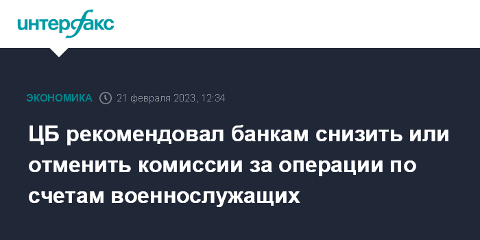 Москва. 21 февраля. INTERFAX.RU - Банк России рекомендовал банкам с 1 марта до окончания специальной военной операции (СВО) снизить или отменить комиссии за некоторые операции по счетам военнослужащих, говорится в сообщении ЦБ.