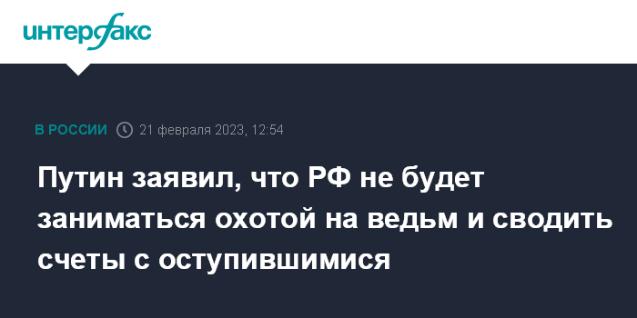 Москва. 21 февраля. INTERFAX.RU - Президент РФ Владимир Путин заявил, что Россия не будет заниматься охотой на ведьм и сводить счеты с теми, кто оступился.