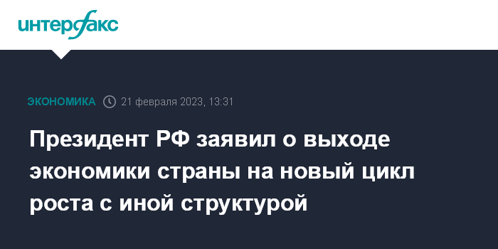 Москва. 21 февраля. INTERFAX.RU - Экономика РФ демонстрировала рост (поквартальный, очищенный от сезонного фактора - ИФ) начиная с III квартала 2022 года, фактически она выходит на новый цикл роста с качественно иной структурой, заявил президент РФ Владимир Путин в послании Федеральному собранию.