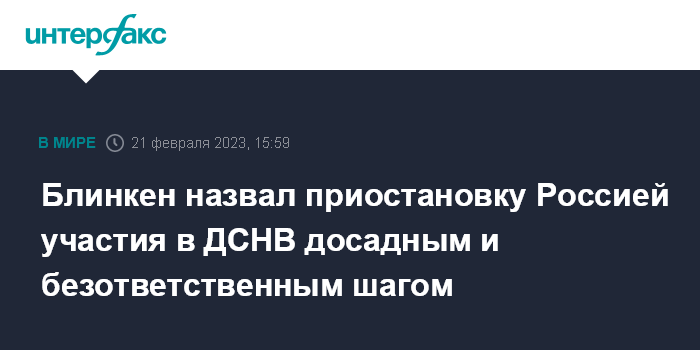Блинкен назвал приостановку Россией участия в ДСНВ досадным и безответственным шагом