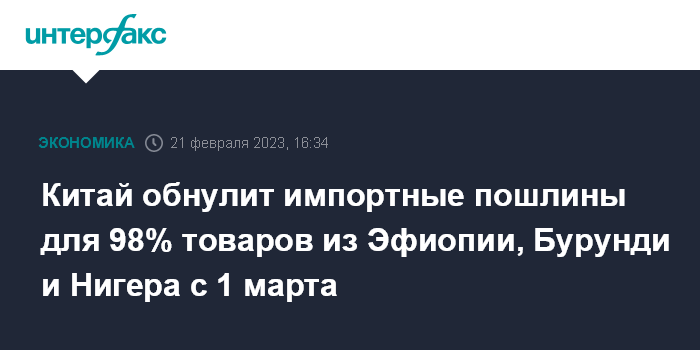 Москва. 21 февраля. INTERFAX.RU - Китай введет нулевые импортные пошлины для 98% наименований облагаемых налогом товаров из Эфиопии, Бурунди и Нигера с 1 марта 2023 года, говорится в сообщении комитета по таможенным тарифам при Госсовете КНР.