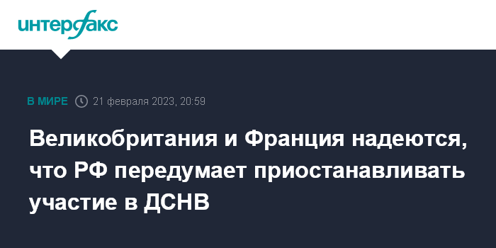 Великобритания и Франция надеются, что РФ передумает приостанавливать участие в ДСНВ