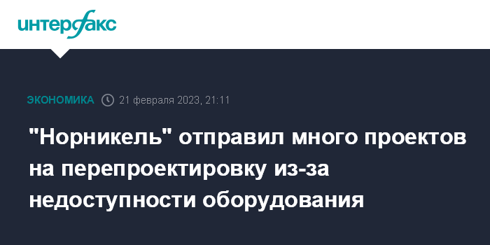 Москва. 21 февраля. INTERFAX.RU - "Норильскому никелю" пришлось отправить на перепроектирование огромное количество проектов из-за отсутствия доступа к оборудованию, сообщил директор департамента по работе с инвестиционным сообществом "Норникеля" Михаил Боровиков, отвечая на вопросы инвесторов на канале БКС Live.