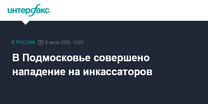 Москва. 6 июля. INTERFAX.RU - В Подмосковном Красногорске в понедельник совершено нападение на инкассаторов, сообщил "Интерфаксу" источник в правоохранительных органах. По предварительным данным, около 12:30 на 22-м км Волоколамского шоссе в Красногорском районе двое неизвестных в камуфлированной форме остановили инкассаторскую машину и, угрожая оружием, похитили сумку с деньгами. По предварительным данным, сумма составляет 2,5 млн рублей.