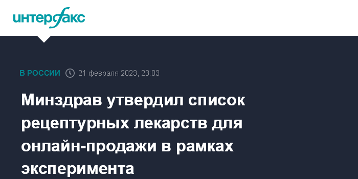 Москва. 21 февраля. INTERFAX.RU - Минздрав РФ утвердил перечень рецептурных препаратов, разрешенных для дистанционной продажи в рамках проводимого в Москве, Московской и Белгородской областях эксперимента, сообщил во вторник министр здравоохранения Михаил Мурашко.