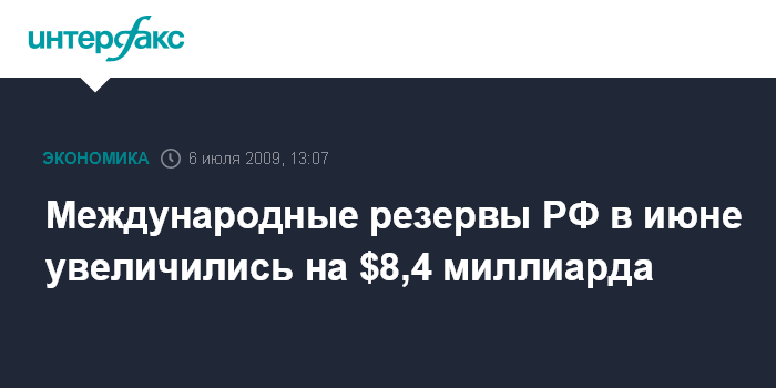 Москва. 6 июня. INTERFAX.RU - Объем международных резервов РФ в июне увеличился на $8,420 млрд, или на 2,1%, - до $412,591 млрд с $404,171 млрд. Такие данные приводятся на интернет-сайте ЦБ РФ. В первом полугодии текущего года резервы уменьшились на $14,489 млрд, или на 3,4%, с $427,080 миллиарда.