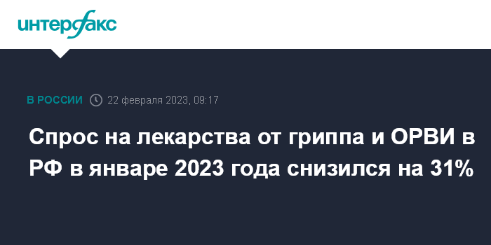 Москва. 22 февраля. INTERFAX.RU - Продажи лекарств от гриппа и ОРВИ в России в январе текущего года снизились на 31% по сравнению с тем же периодом прошлого года, в аптеках было продано более 17 млн упаковок, сообщил "Интерфаксу" оператор системы маркировки "Честный знак" - Центр развития перспективных технологий (ЦРПТ).