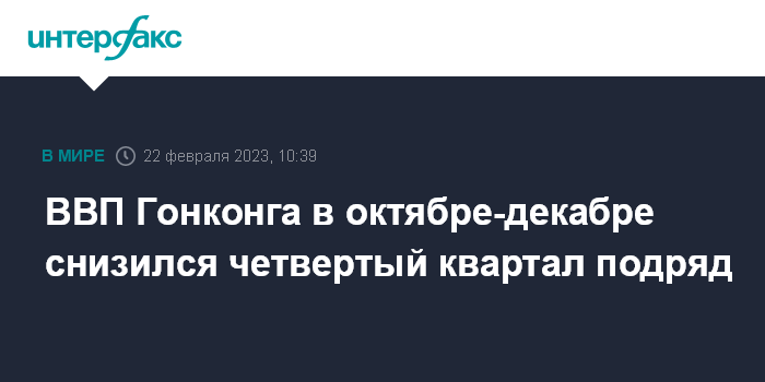 Москва. 22 февраля. INTERFAX.RU - Объем экономики Гонконга в четвертом квартале упал на 4,2% относительно аналогичного периода предыдущего года. Об этом свидетельствуют окончательные данные статистического управления.