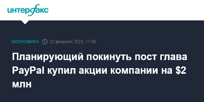 Москва. 22 февраля. INTERFAX.RU - Главный исполнительный директор PayPal Holdings Inc Дэн Шульман, планирующий покинуть свой пост в конце 2023 года, купил акции компании на сумму около $2 млн в конце прошлой недели.