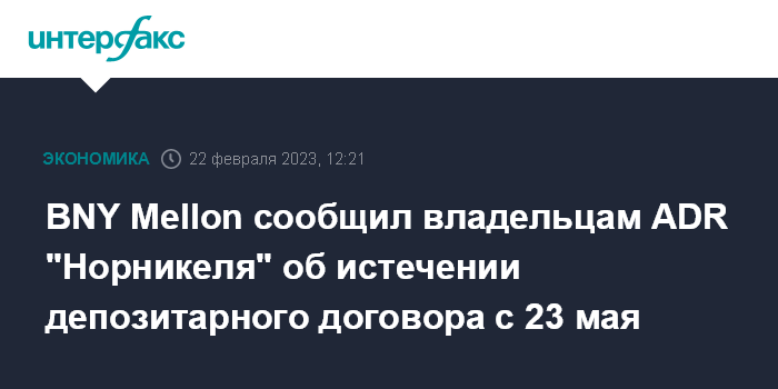 Москва. 22 февраля. INTERFAX.RU - The Bank of New York Mellon уведомил владельцев ADR "Норильского никеля" ("Норникеля") об истечении депозитарного договора с 23 мая текущего года, говорится в сообщении депозитария.
