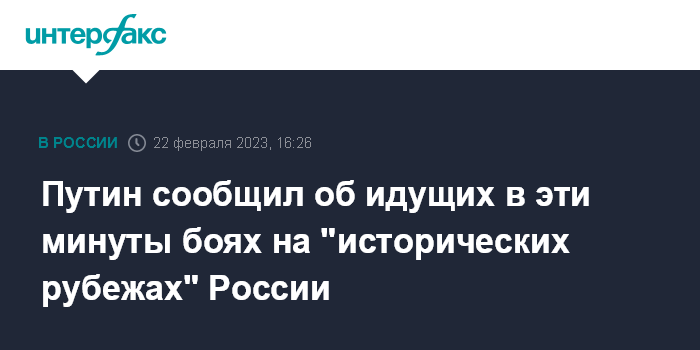Москва. 22 февраля. INTERFAX.RU - Президент РФ Владимир Путин сообщил, что заслушал доклады высшего военного руководства страны о ходе специальной военной операции, его проинформировали о ведущемся буквально в эти минуты бое.