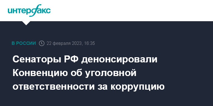 Москва. 22 февраля. INTERFAX.RU - Совет Федерации на заседании в среду одобрил денонсацию Конвенции об уголовной ответственности за коррупцию.