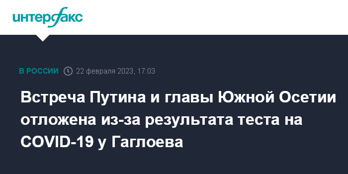 Москва. 22 февраля. INTERFAX.RU - Переговоры президента Владимира Путина с президентом Южной Осетии Аланом Гаглоевым отложены из-за положительного теста на COVID-19 у главы Южной Осетии, сообщил "Интерфаксу" пресс-секретарь Путина Дмитрий Песков.