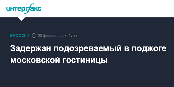 Москва. 22 февраля. INTERFAX.RU - Столичное управление Следственного комитета РФ сообщает о задержании уроженца Белгородской области по делу о гибели людей в пожаре в московской гостинице.