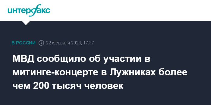 Москва. 22 февраля. INTERFAX.RU - В полиции численность участников митинга-концерта "Слава защитникам Отечества" в Лужниках оценили более чем в 200 тысяч человек. Об этом сообщила представитель МВД России Ирина Волк.