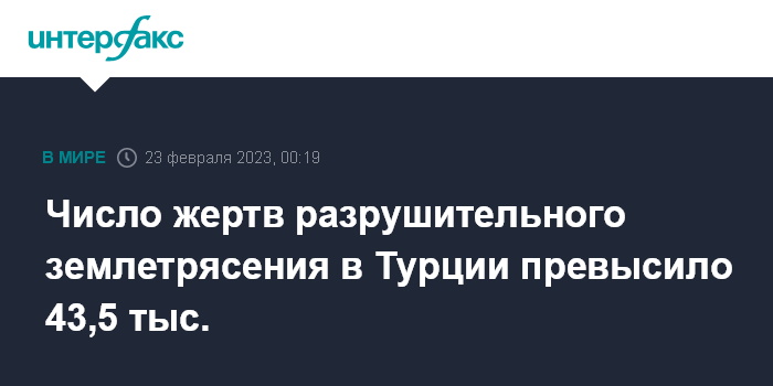 Число жертв разрушительного землетрясения в Турции превысило 43,5 тыс.
