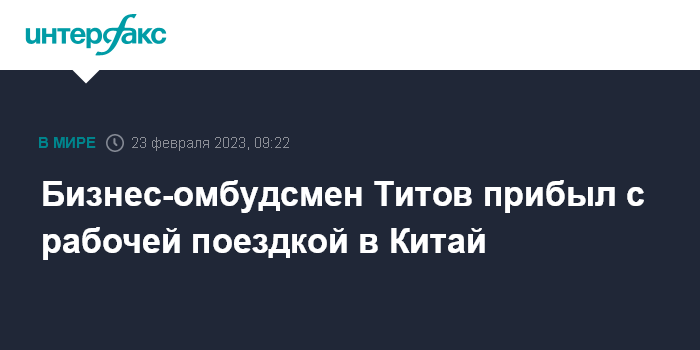Москва. 23 февраля. INTERFAX.RU - Уполномоченный при президенте РФ по защите прав предпринимателей Борис Титов, который также является председателем Российско-Китайского комитета дружбы, мира и развития, прибыл с рабочей поездкой КНР.