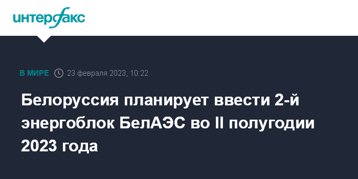 Москва. 23 февраля. INTERFAX.RU - Второй энергоблок БелАЭС планируется ввести в промышленную эксплуатацию во втором полугодии 2023 года, сообщил министр энергетики Белоруссии Виктор Каранкевич.
