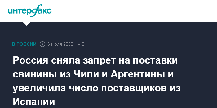 Москва. 6 июля. INTERFAX.RU - Россия сняла запрет на поставки свинины из Чили и Аргентины, введенные в связи с гриппом H1N1, и увеличила число поставщиков из Испании.