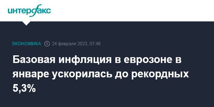 Москва. 24 февраля. INTERFAX.RU - Темпы роста потребительских цен в еврозоне в январе были выше предварительных оценок, базовая инфляция достигла рекордного уровня, свидетельствуют окончательные данные Статистического управления Европейского союза (Eurostat).