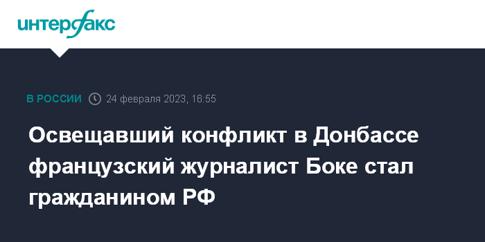 Москва. 24 февраля. INTERFAX.RU - Адриан Боке - французский журналист и военный эксперт, освещавший конфликт в Донбассе - принят в российское гражданство.