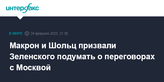 Москва. 24 февраля. INTERFAX.RU - Президент Франции Эммануэль Макрон и канцлер Германии Олаф Шольц на недавней встрече в Париже призывали президента Украины Владимира Зеленского рассмотреть возможность переговоров с Москвой, сообщает в пятницу The Wall Street Journal (WSJ).