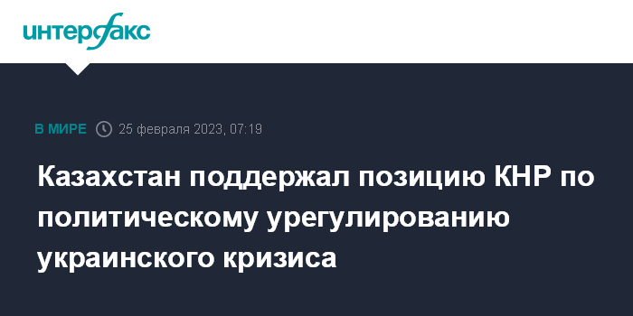 Москва. 25 февраля. INTERFAX.RU - Казахстан приветствует позицию Китая по политическому урегулированию украинского кризиса, считает мирное решение данной проблемы на основе принципов Устава ООН безальтернативным, заявил МИД республики.