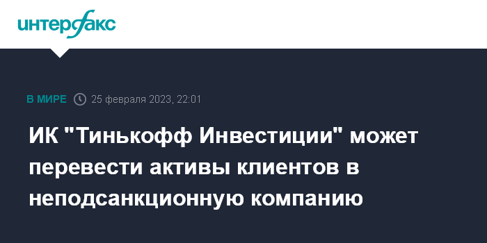 Москва. 25 февраля. INTERFAX.RU - Инвесткомпания (ИК) "Тинькофф Инвестиции" в связи с информацией о введении Евросоюзом санкций против Тинькофф банка сообщила, что может перевести активы клиентов в неподсанкционную компанию.