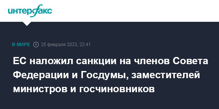 Москва. 25 февраля. INTERFAX.RU - В новый пакет антироссийских санкций Евросоюза попали десятки физлиц - ряд членов Совета Федерации и Государственной думы, заместители министров, государственные чиновники, уполномоченная по правам человека в РФ Татьяна Москалькова.