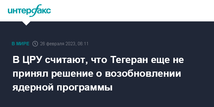 Москва. 26 февраля. INTERFAX.RU - Директор Центрального разведывательного управления (ЦРУ) США Уильям Бернс считает, что в Тегеране пока не принято решение о возобновлении программы, направленной на производство ядерного оружия.
