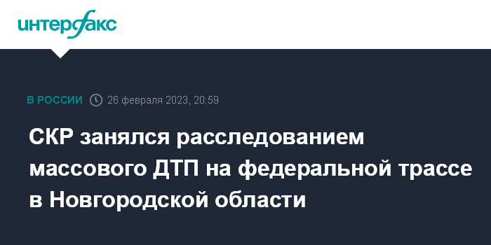 Москва. 26 февраля. INTERFAX.RU - Начато расследование обстоятельств массового столкновения автомобилей в Новгородской области, сообщает телеграм-канал Следственного комитета РФ (СКР).