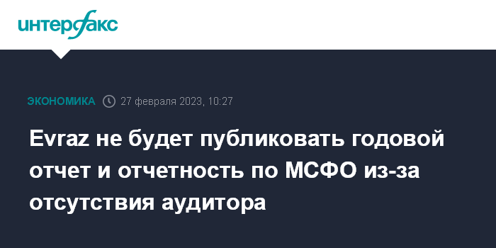 Москва. 27 февраля. INTERFAX.RU - Evraz не будет публиковать годовой отчет и отчетность по МСФО за 2022 год из-за невозможности найти аудитора на фоне введенных в отношении компании санкционных ограничений, говорится в сообщении Evraz.